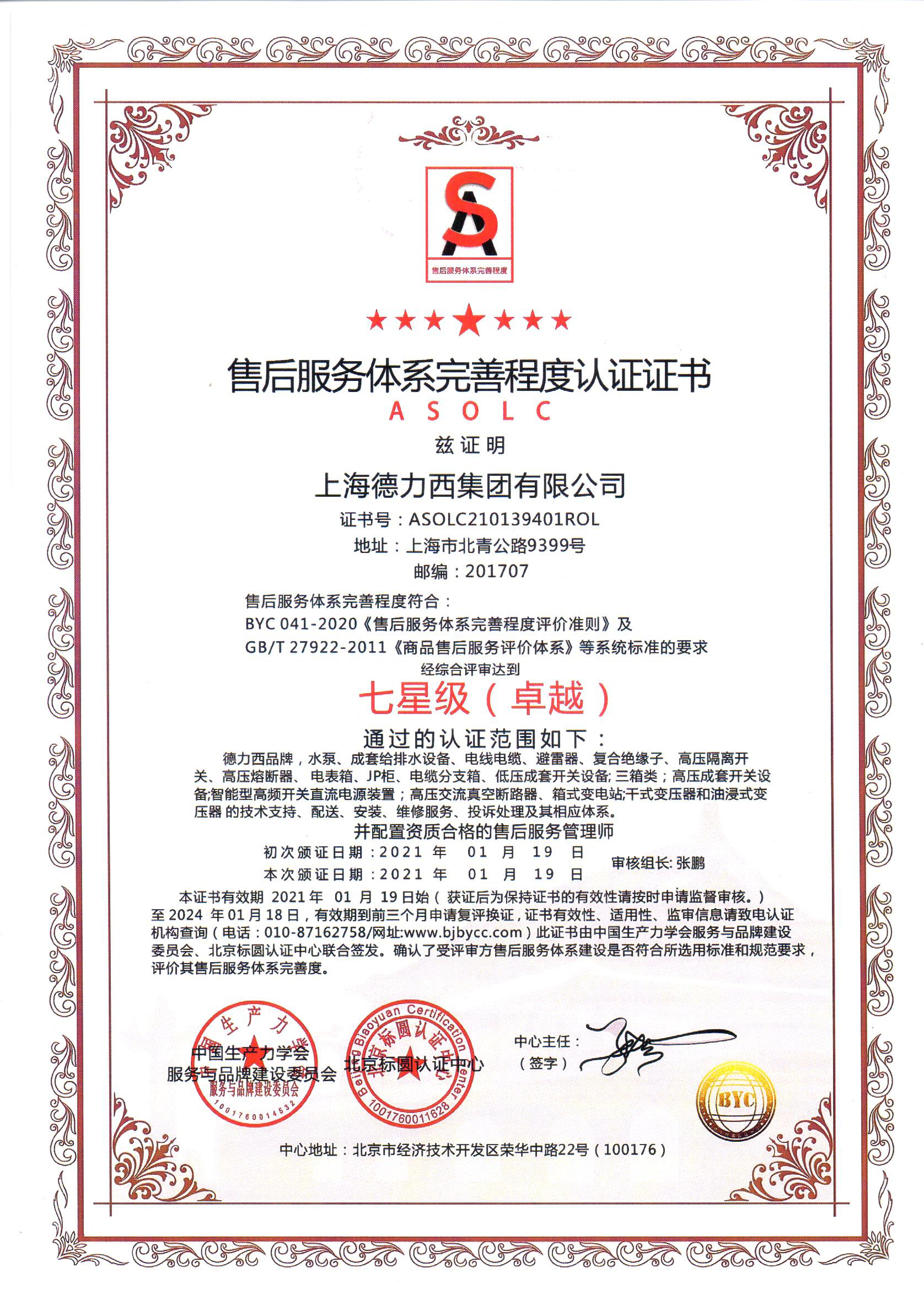 售后服務(wù)認證證書